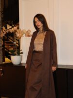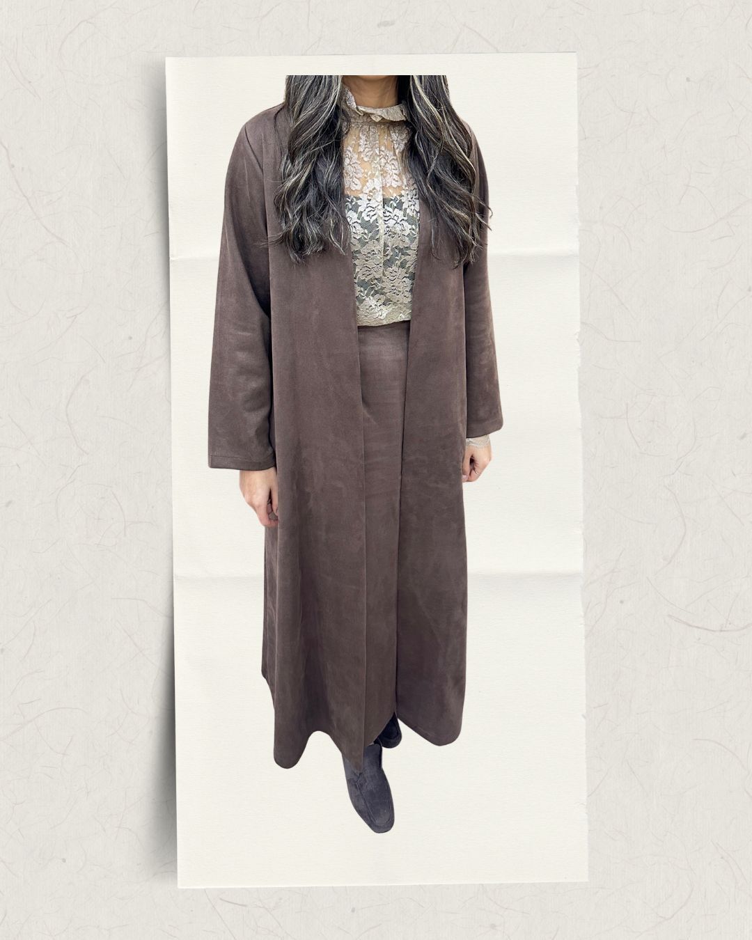 3 pieces set. A long brown coat with a matching skirt and a light lace top for a soft, elegant look