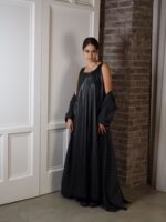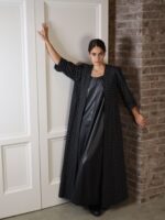 A black leather dress paired with a long black-and-white plaid jacket for a modern layered look.