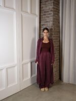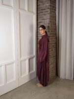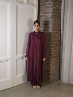 Relaxed two-piece pant and long shirt in a rich plum tone, designed for soft structure