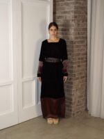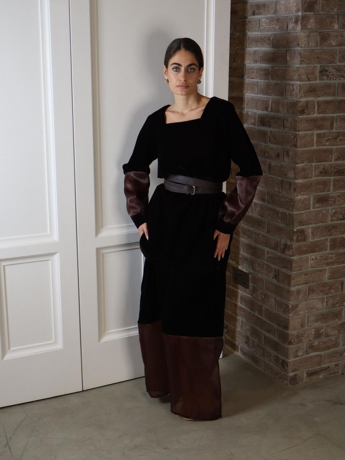 A brown top and skirt with sheer brown sleeves and a sheer hem, finished with a matching burgundy belt.